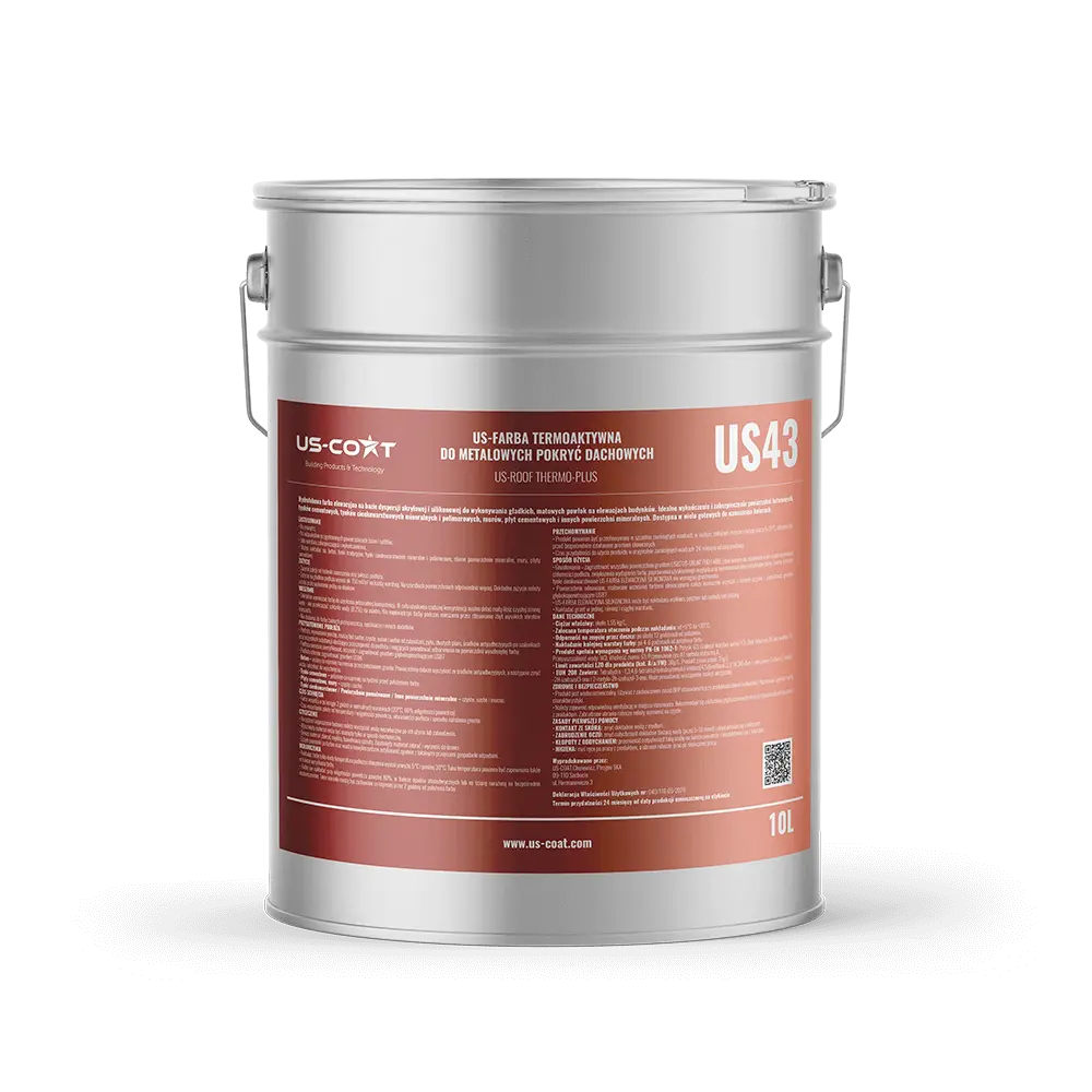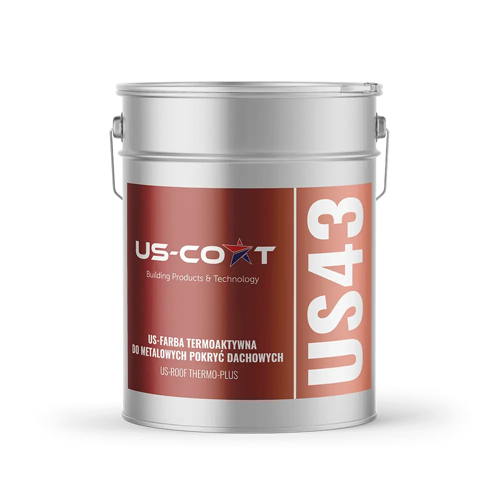 do renowacyjnego malowania metalowych pokryć dachowych z technologią ograniczającą nagrzewanie i utratę ciepła.Dzięki zastosowaniu rozwiniętej technologii pigmentowania powłoka US43 US-ROOF THERMO PLUS redukuje nagrzewanie powierzchni nawet o 13-18 stopni Celsjusza. Zmniejsza to naprężania związane z cyklicznym nagrzewaniem i stygnięciem powłoki jak i całego poszycia, co znacznie przedłuża jego trwałość. Obniżenie temperatury powierzchni dachu pozytywnie wpływa także na komfort cieplny w pomieszczeniach użytkowych na poddaszu. Dzięki zastosowaniu odpowiedniej technologii ograniczona jest także ucieczka ciepła z wnętrza budynku co przekłada się na zmniejszenie kosztów ogrzewania.