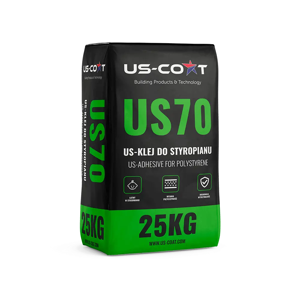 • Odpowiednim podłożem do przyklejenia płyt izolacyjnych klejem US70 są: beton, cementowy tynk elewacyjny, ściany z betonu, gazobeton, silikat, bloczki ceramiczne i inne bloki mineralne, płyty gipsowo kartonowe. Nie stosować na powierzchniach gipsowych bez warstwy ochronnej.