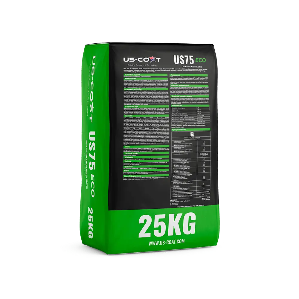 • Temperatura powietrza i powierzchni, na którą nakładany jest klej US75 ECO w trakcie jego użytkowania, oraz w ciągu 24 godzin po zakończeniu pracy, musi wynosić min. 5°C. W tym czasie (24 godziny) konieczne jest przechowywanie wyników zakończonych prac budowlanych przy użyciu doraźnych środków ochrony (folia, siatka, parasole) przed deszczem, wysoką wilgotnością i nagłym spadkiem temperatury. Przyjmuje się, że czas wiązania to ok. 24 h na każdy mm grubości warstwy, w warunkach normalnych czyli przy temperaturze powietrza 18-23 ° C i wilgotności względnej ok. 60-65% i może się zmieniać w innych warunkach atmosferycznych.
